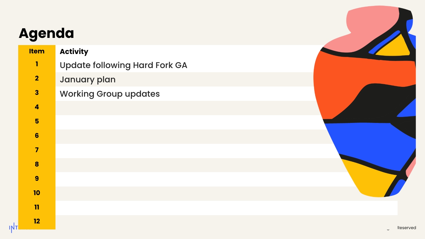 - Updates on working groups were provided, including the audit group (Jose), process group (Chris), and tax implications working group (newly formed with Kristijan and Rita)
